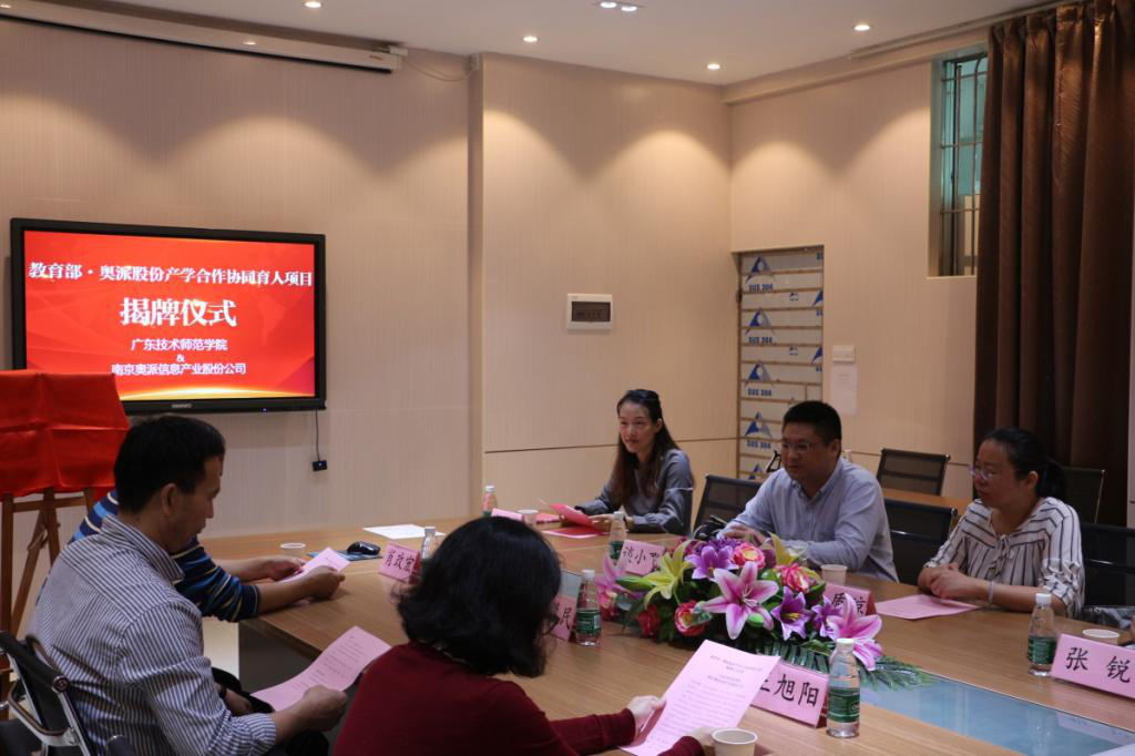 2018年11月15日,南京奥派信息产业股份公司与广东技术师范学院的教育部产学合作协同育人项目签约仪式在校本部计算机科学学院会议室隆重举行。南京奥派信息产业股份公司华南区总经理谈小飞、广东技术师范学院计算机科学学院院长赵慧民、副院长肖政宏等相关领导以及项目负责人肖茵茵(计算机科学学院教师)、卜质琼(管理学院教师)等相关教师共同出席了本次签约仪式。
