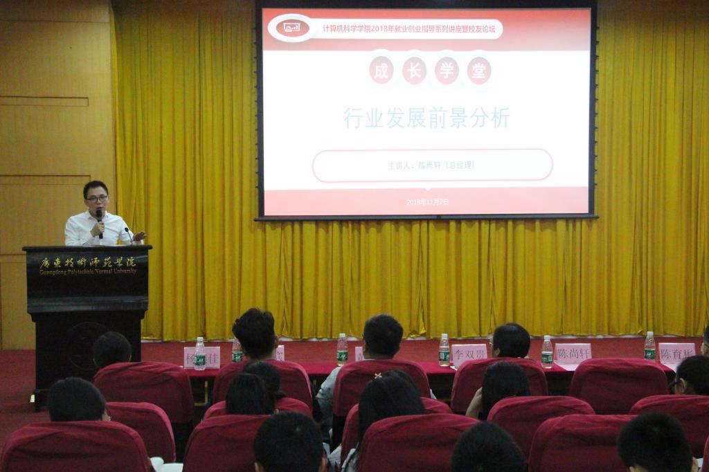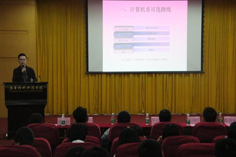 之后是校友讲座。2000级校友、广州红讯软件有限公司创始人陈尚轩,他分享自身真实的大学生活和精彩的创业故事的同时,并分析了行业发展的前景,告诫同学们民族复兴的接力棒很快就要交到我们手上,要感受时代发展的脉搏,树立远大理想,发挥创新精神,为祖国的发展、民族的振兴贡献我们的计科力量。2010级校友、腾讯音乐集团及酷狗音乐高级开发工程师陈育彬,他以自身职场经验和思考为基础,向同学们贡献了一场精彩的职业规划课,对同学们了解当下时代需求,做好职业规划提供了巨大的帮助。