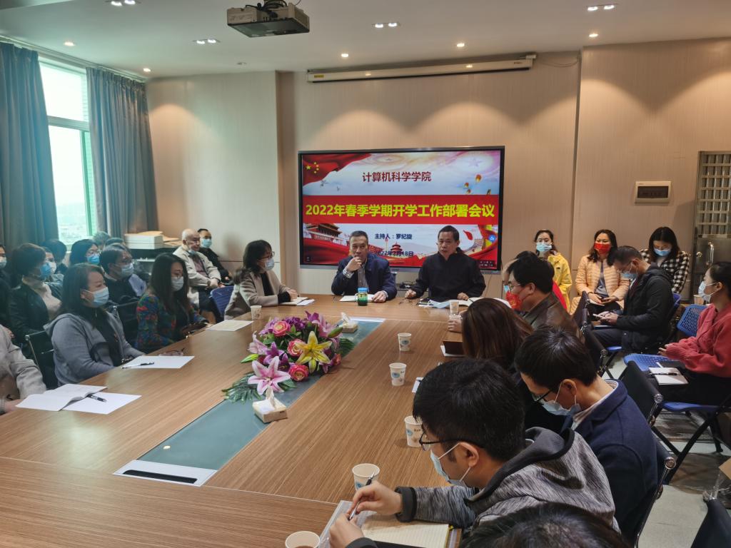 为确保2022年春季新学期工作正常有序开展,计算机科学学院提前部署、周密安排,召开了学院2022学年春季学期开学工作部署会议,学院领导班子、全体教职工参加会议,罗纪旋书记主持会议。