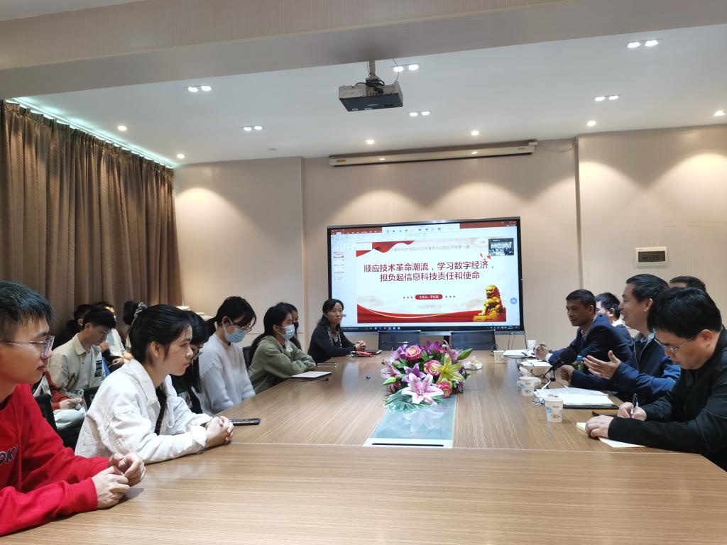 学院党委书记罗纪旋以《顺应技术革命潮流,学习数字经济,担负起信息科技责任和使命》为题,从以毛泽东为核心的中共第一代领导集体率先提出了“向科技进军”的口号,到习近平总书记提出的“坚持建设世界科技强国”的奋斗目标,带领大家回忆了国家历任领导人对科技发展战略的阐述。罗纪旋带领大家了解数字经济的重要内涵和发展趋势,数字经济对推动社会经济高质量发展的重要意义,进一步激发学生学习数字经济的兴趣和热情,勉励大家要有责任有使命,担当起科技发展的重任。