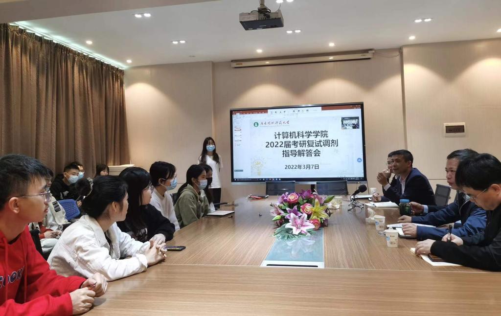 为更好帮助考研同学理清思路、找准方向、顺利通过复试,圆梦考研,计算机科学学院于3月7日上午在学院1212会议室召开2022届毕业生考研复试及调剂交流会。考虑到疫情防控要求和我院与深圳信息职业技术学院联合培养的毕业生群体,此次会议采取线上线下相结合的方式。学院党委书记罗纪旋、院长赵慧民、副书记杨燕佳、副院长陈荣军出席了交流会。学院还邀请了研究生院副院长丁燕红、研究生招生办公室科长曾祥书现场为同学们答疑解惑。会议由杨燕佳主持。