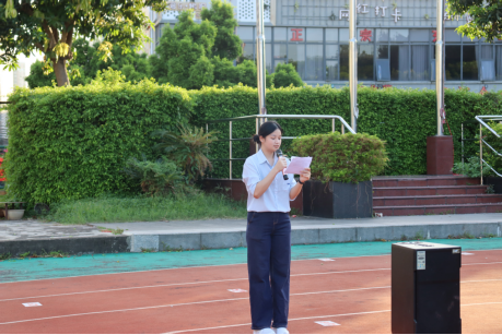 紧接着,优秀学生代表汤欣怡以《与广师大共成长,以笃学致青春》为题在国旗下发表演讲。在广师大“厚德博学、唯实求新”的氛围与计科院“笃学实干”理念指引下,她号召同学们在面对学科竞赛等挑战时,要从学院精神与师长关怀中汲取力量,勇敢跨越挫折;同时鼓励大家主动走出校园,运用专业技能投身志愿实践活动,在服务社会中实现从“为己之学”到“为人之学” 的升华,展现广师大学子风采;最后她还寄语同学们珍惜校园资源,与学校共进步、为计科添光彩。