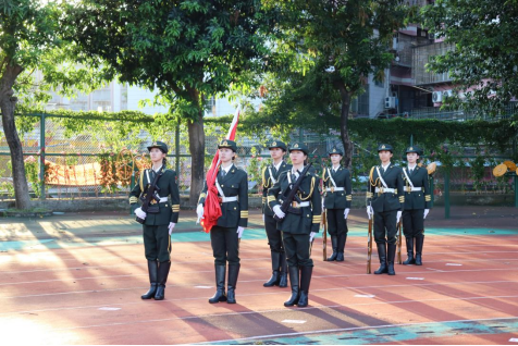 晨曦初露,国旗飘扬。上午7时整,英姿飒爽的国旗护卫队迈着铿锵有力的步伐,护卫着五星红旗走向升旗台。在庄严的国歌声中,全体师生肃立行注目礼,鲜艳的五星红旗迎着朝阳冉冉升起,点燃了在场每一位师生心中的爱国热情与使命担当。