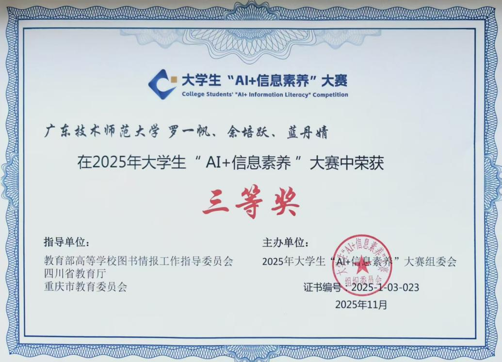 2025年11月27日,全国大学生“AI+信息素养”大赛全国联赛本科生赛道颁奖典礼在成都圆满收官,我院2025级新生罗一帆同学领衔的参赛团队荣获全国联赛本科生赛道三等奖,充分展现了我院学子扎实的专业素养与锐意进取的精神风貌。