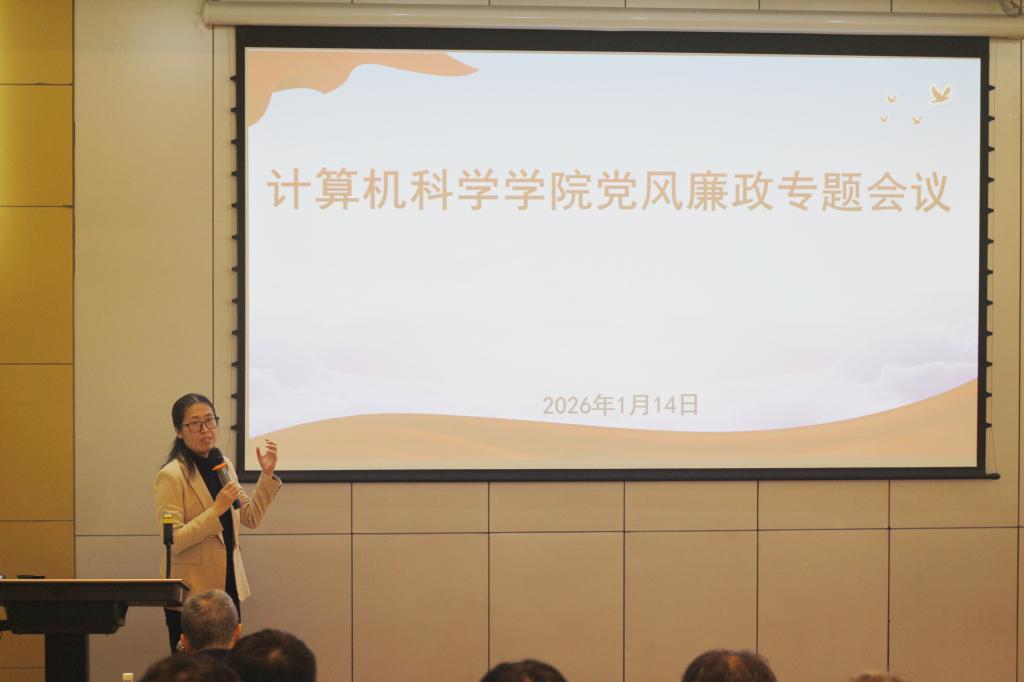为深入贯彻落实全面从严治党要求,切实压实党风廉政建设主体责任,筑牢全院教职工廉洁自律思想防线,1月14日,计算机科学学院在一教209召开党风廉政专题会议。学院全体教职工参会,会议由学院党委书记李双贵主持。