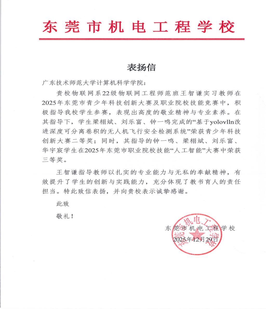 信中指出,王智谦同学在协助该校师生备战2025年东莞市青少年科技创新大赛及职业院校技能竞赛期间,充分发挥专业所长,主动担当、倾囊相授。他凭借扎实的专业知识和高度的责任心,全程投入备赛指导工作,不仅助力该校学生完成的“基于yolov11n改进深度可分离卷积的无人机飞行安全检测系统”项目斩获青少年科技创新大赛二等奖,还带领学生团队在职业院校技能“人工智能”大赛中取得三等奖。其严谨务实的工作态度和出色的专业能力,得到了师生的一致认可。