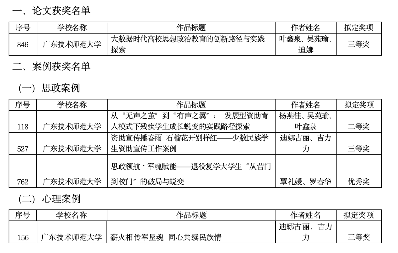 其中,学院党委副书记杨燕佳、辅导员吴苑瑜、叶鑫泉的《从“无声之茧”到“有声之翼”:发展型资助育人模式下残疾学生成长蜕变的实践路径探索》荣获案例征集活动二等奖、辅导员迪娜的《资助宣传播春雨石榴花开别样红—少数民族学生资助宣传工作案例》荣获案例征集活动三等奖、辅导员覃礼媛的《思政领航 、军魂赋能退役复学大学生“从营门到校门”的破局与蜕变》荣获案例征集活动优秀奖;辅导员叶鑫泉、吴苑瑜、迪娜的《大数据时代高校思想政治教育的创新路径与实践探索》荣获论文征集活动三等奖;辅导员迪娜的《薪火相传军垦魂同心共续民族情》荣获心理案例征集活动三等奖